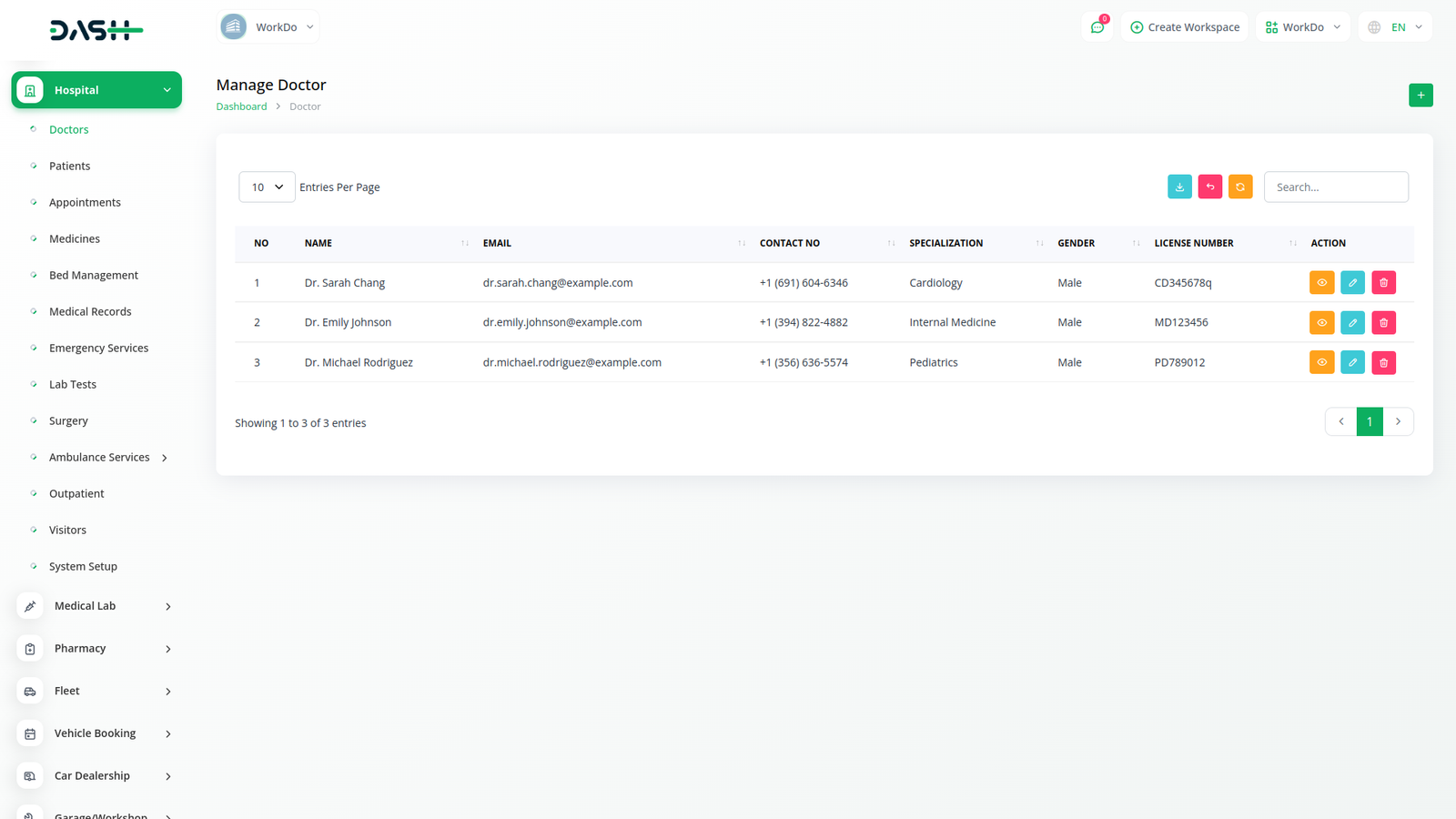 يحتفظ نظام إدارة المستشفيات بقاعدة بيانات شاملة لجميع الممارسين الطبيين المرتبطين بالمنشأة. يتضمن كل ملف تعريف طبيب معلومات أساسية مثل الاسم وتفاصيل الاتصال والتخصص وسنوات الخبرة ورسوم الاستشارة وتفاصيل الترخيص.