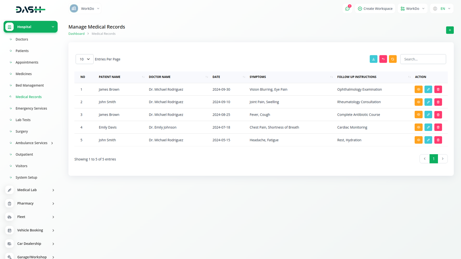 يتم تنظيم سجلات المرضى بدقة داخل نظام إدارة المستشفى، وتحتوي على معلومات حيوية مثل اسم المريض والبريد الإلكتروني والطبيب المعين وتاريخ الميلاد وتفاصيل الاتصال والجنس والتاريخ الطبي والعنوان. يلتقط النظام التاريخ الطبي للمرضى ويحدثه، مما يوفر لمهنيي الرعاية الصحية فهما شاملا للحالة الصحية للمرضى.