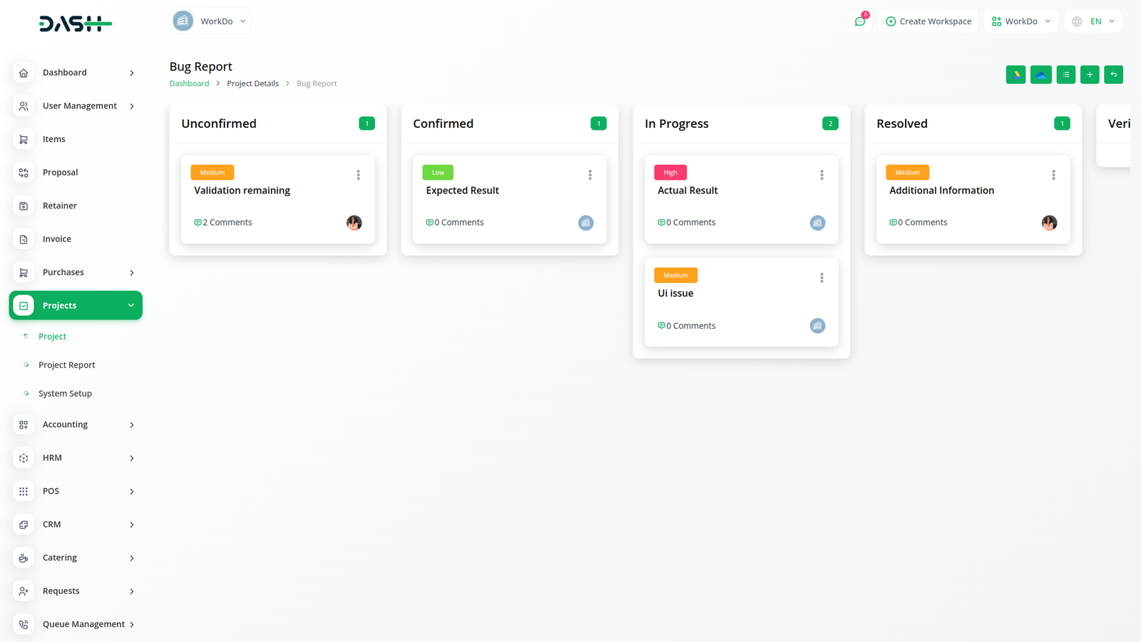 إنشاء أخطاء جديدة وتعيين المستخدمين والأولوية لهم. يمكنك كتابة ملاحظة في مربع النص لوصف الخطأ. كما يمكن تغيير حالة كل خطأ من خلال القائمة المنسدلة السهلة ونظام سحب كانبان.