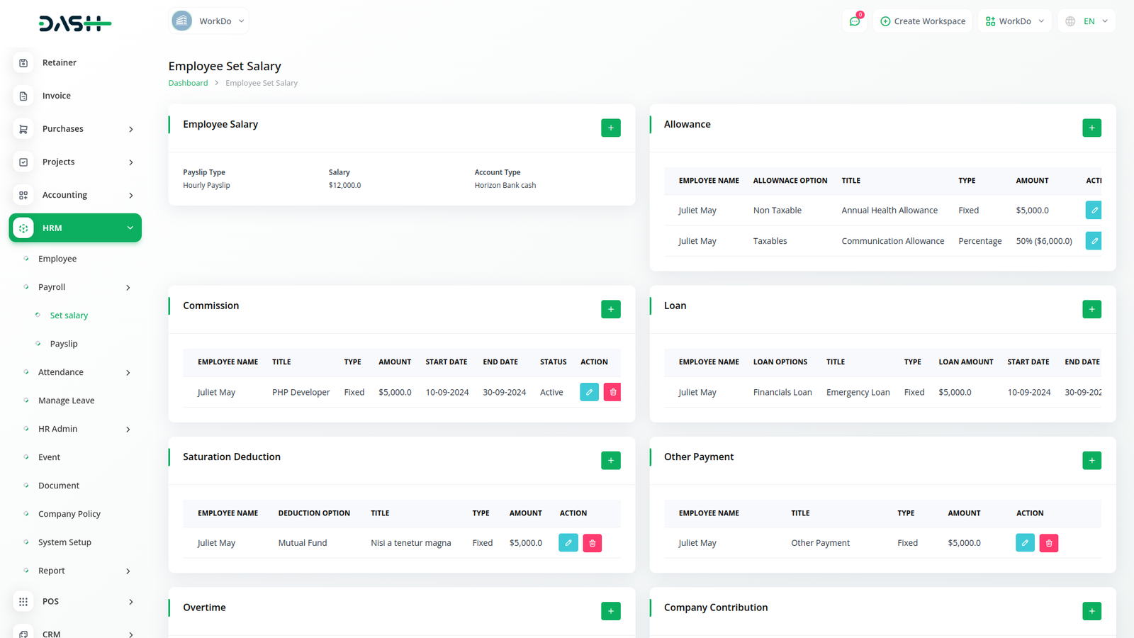 يمكنك إنشاء قسائم الرواتب الشهرية وإجراء الدفعات الجماعية بسهولة عبر بضع نقرات. يمكنك أيضًا تغيير حالة قسيمة الراتب من خلال زر إجراء بسيط. يمكن للموظف عرض تفاصيل مكونات راتبه.