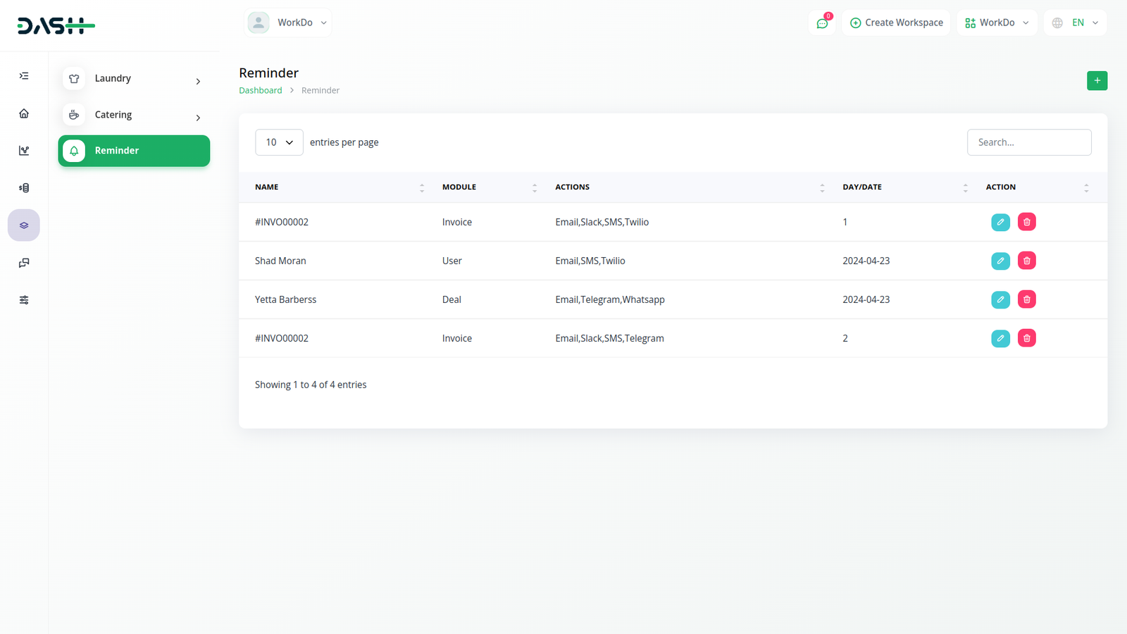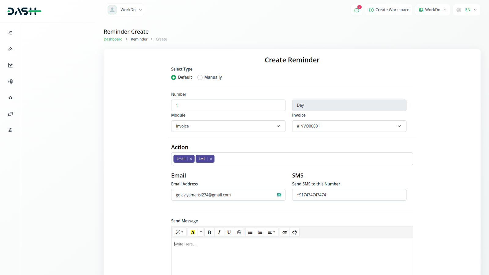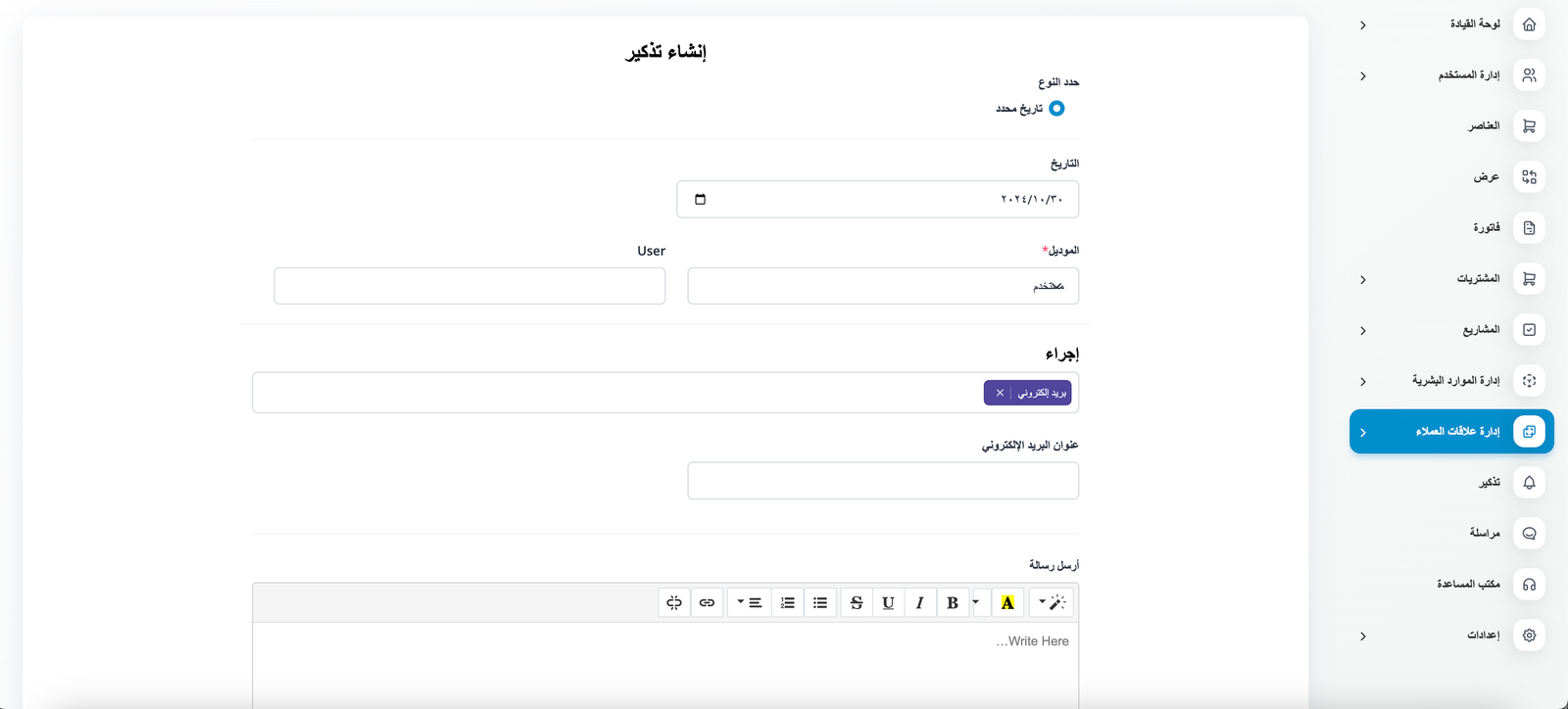 إنشاء تذكيرات جديدة سريع وسهل. ما عليك سوى إدخال تفاصيل تذكيرك، بما في ذلك الإجراء والتاريخ وأي رسائل. سواء كان ذلك عميلا محتملا أو فاتورة أو معاملة أو مستخدما، تسمح لك وحدتنا بتعيين تذكيرات لأي حدث أو نشاط دون عناء.