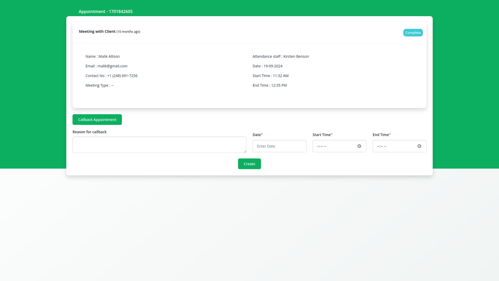 يبسط نظام جدولة المواعيد سهل الاستخدام لدينا إدارة المواعيد، مما يسمح بالتنظيم والتتبع والتحسين الفعال للاستخدام التجاري أو الشخصي. يتميز بلوحة معلومات، وزر تقويم، وتغيير اللون، وأنواع الاجتماعات، ونموذج إلغاء الموعد، ونموذج معاودة الاتصال بالموعد، وبعد اكتمال الموعد، وإرسال نموذج الملاحظات، وزر نسخ الرابط لسهولة تقديم النموذج. يمكن للمستخدمين إنشاء المواعيد وتحديثها لضمان جدولة سلسة وجدولة فعالة لاحتياجاتهم.