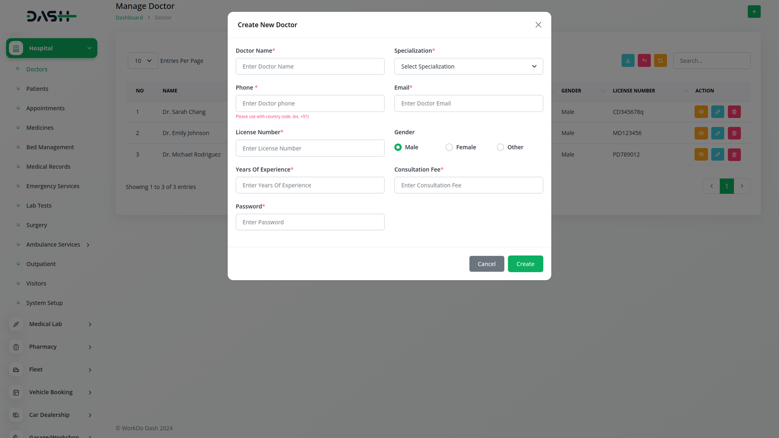 يحتفظ نظام إدارة المستشفيات بقاعدة بيانات شاملة لجميع الممارسين الطبيين المرتبطين بالمنشأة. يتضمن كل ملف تعريف طبيب معلومات أساسية مثل الاسم وتفاصيل الاتصال والتخصص وسنوات الخبرة ورسوم الاستشارة وتفاصيل الترخيص.