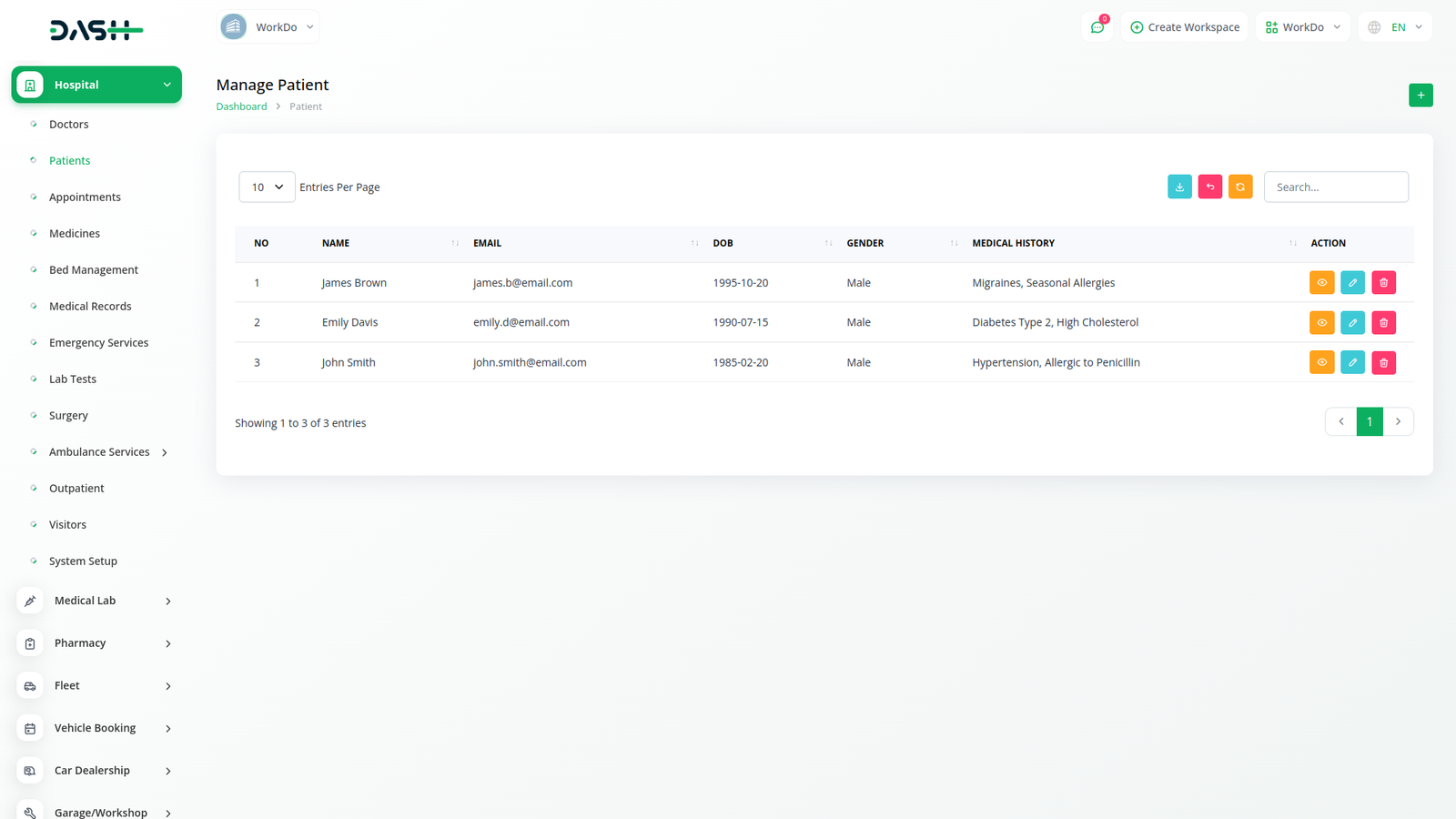 يتم تنظيم سجلات المرضى بدقة داخل نظام إدارة المستشفى، وتحتوي على معلومات حيوية مثل اسم المريض والبريد الإلكتروني والطبيب المعين وتاريخ الميلاد وتفاصيل الاتصال والجنس والتاريخ الطبي والعنوان. يلتقط النظام التاريخ الطبي للمرضى ويحدثه، مما يوفر لمهنيي الرعاية الصحية فهما شاملا للحالة الصحية للمرضى.