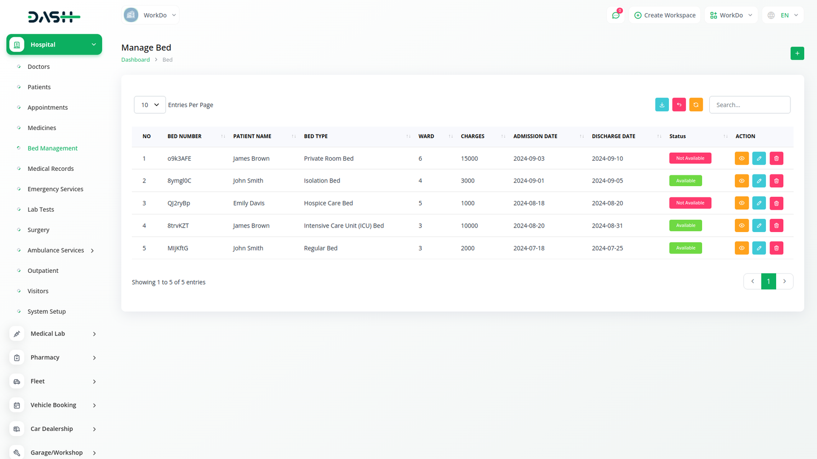 تعمل ميزة إدارة الأسرّة على تحسين تخصيص سرير المستشفى. حيث يوفر النظام نوع السرير والجناح وتعيين المريض والرسوم وتاريخ القبول وتاريخ التفريغ والحالة مما يسمح للموظفين بتخصيص الأسرّة بكفاءة بناء على احتياجات المريض.