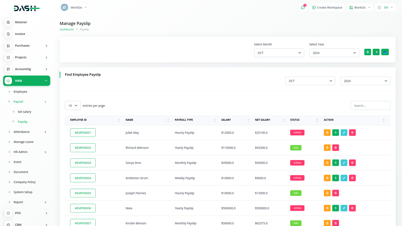 يمكنك إنشاء قسائم الرواتب الشهرية وإجراء الدفعات الجماعية بسهولة عبر بضع نقرات. يمكنك أيضًا تغيير حالة قسيمة الراتب من خلال زر إجراء بسيط. يمكن للموظف عرض تفاصيل مكونات راتبه.