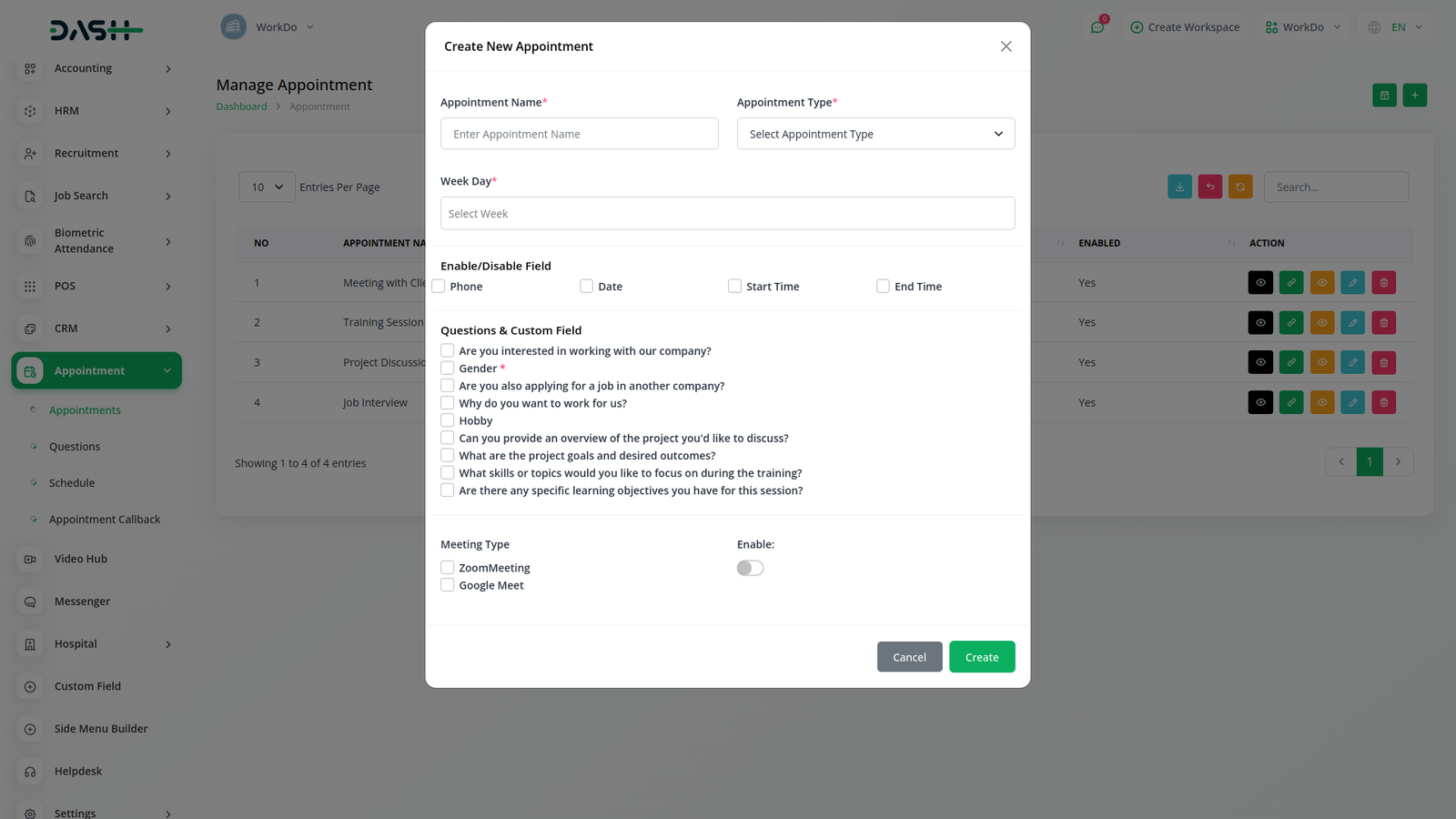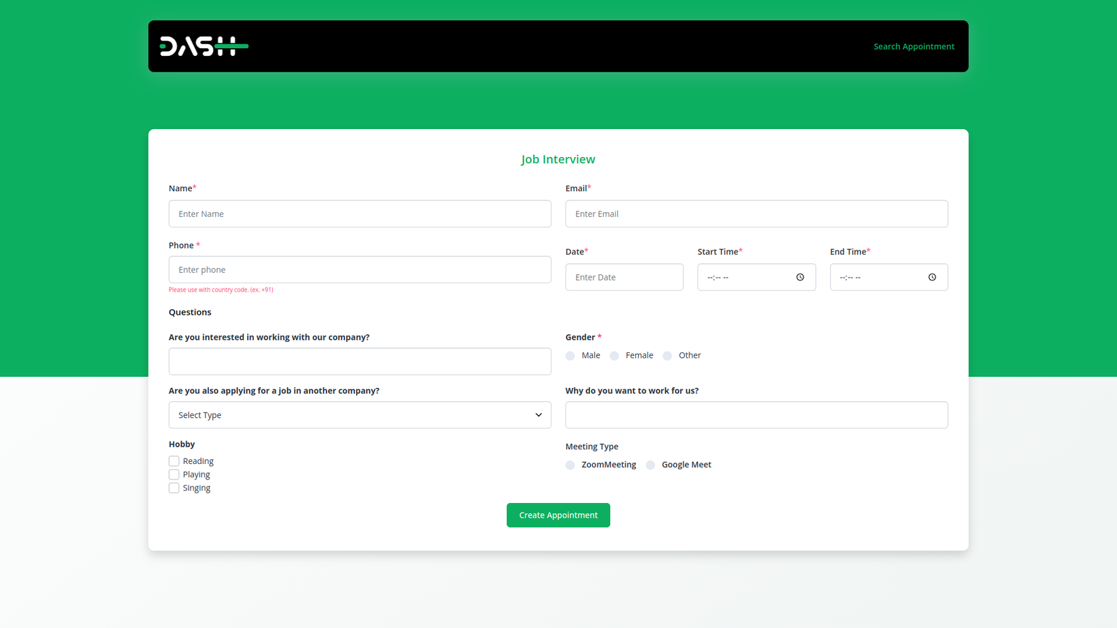 يبسط نظام جدولة المواعيد سهل الاستخدام لدينا إدارة المواعيد، مما يسمح بالتنظيم والتتبع والتحسين الفعال للاستخدام التجاري أو الشخصي. يتميز بلوحة معلومات، وزر تقويم، وتغيير اللون، وأنواع الاجتماعات، ونموذج إلغاء الموعد، ونموذج معاودة الاتصال بالموعد، وبعد اكتمال الموعد، وإرسال نموذج الملاحظات، وزر نسخ الرابط لسهولة تقديم النموذج. يمكن للمستخدمين إنشاء المواعيد وتحديثها لضمان جدولة سلسة وجدولة فعالة لاحتياجاتهم.