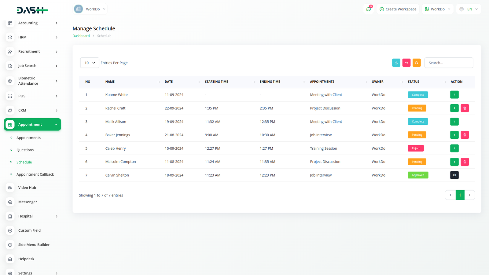 في قسم الجدول الزمني، يتم عرض تفاصيل نموذج الموعد المكتمل. في ذلك، يمكن تغيير إجراء حالة الجدول الزمني. لديه خيار الموافقة على المواعيد، ورفض المواعيد، وتعيين المستخدمين، وإكمال المواعيد، وإرسال نماذج التعليقات بعد الانتهاء. هنا، سيتم إرسال الموافقة على الموعد أو الرفض إلى المعين من خلال بريده الإلكتروني عند ملء النموذج، وسيتم أيضا إرسال نموذج ملاحظات.