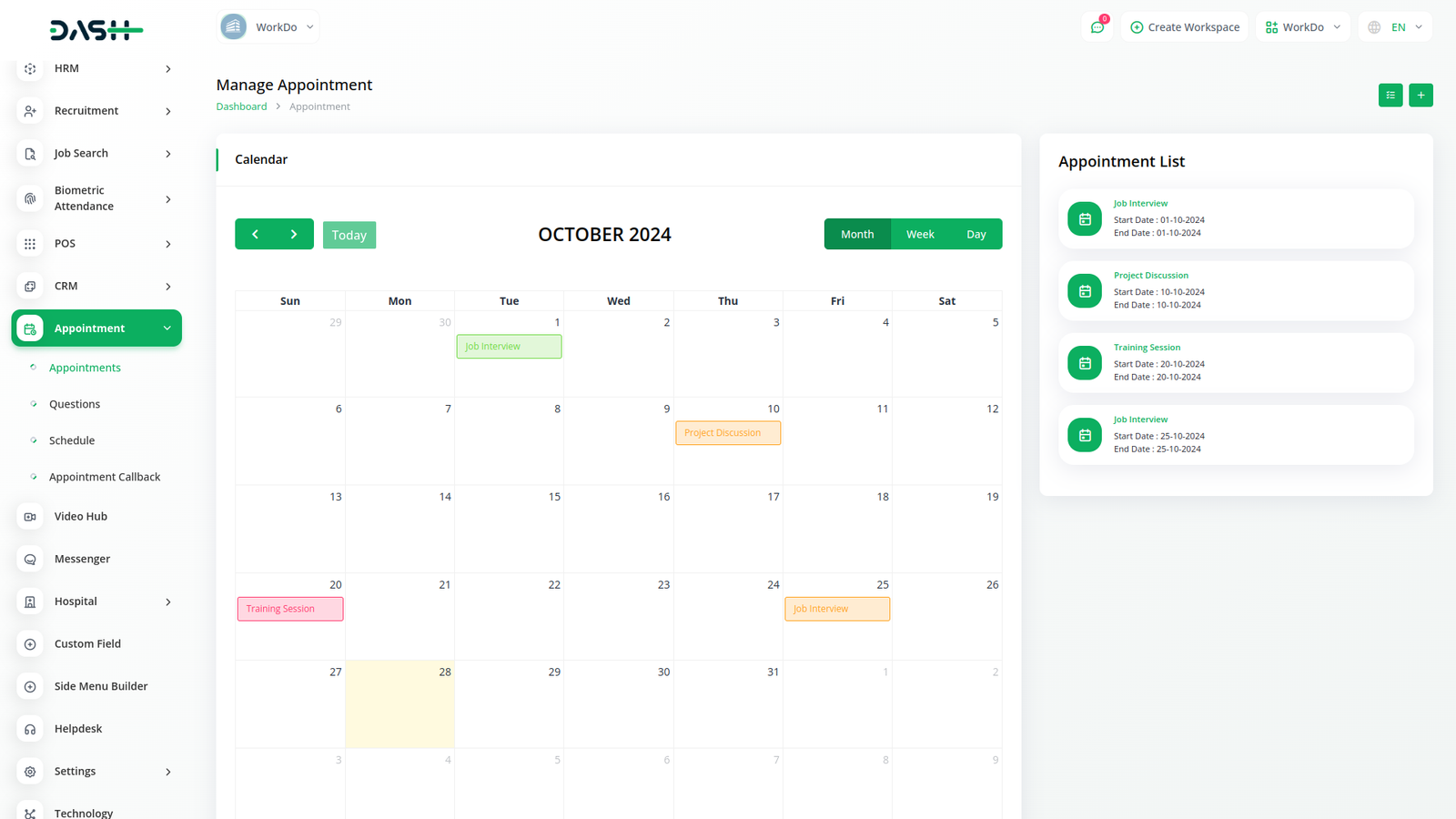 في قسم المواعيد، يمكنك تحديد موعد. يحتوي على زر تقويم يعرض جميع المواعيد ويغير اللون وفقا لحالة الموعد. يحتوي على زر رابط نسخ، حيث يمكن لأي مستخدم ملء نموذج الموعد.